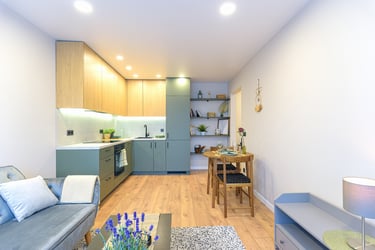 – LED apšvietimas sumontuotas virtuvės balduose, vonioje bei išryškina akcentines buto sienas ir lubas, sukuriant jaukią ir modernią atmosferą.