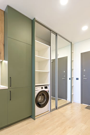 – Butas įrengtas su pagal užsakymą gamintais kokybiškais, įmontuojamais baldais, maksimaliai išnaudojant erdvę.